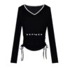 V-Neck Black Drawstring Slim Fit Long Sleeves
